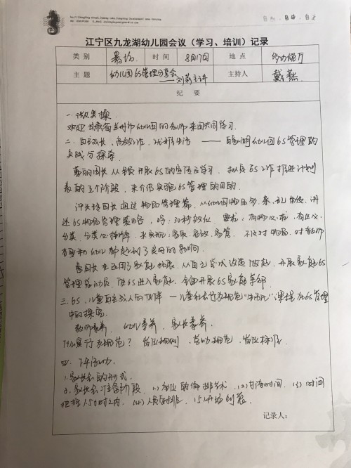 讲座开始,刘莉园长向现场的所有教职工展示了6s管理下的幼儿生活和教师工作的整洁环境及无6s管理下的杂乱环境。鲜明对比,令人反思。了解到6s管理的必要性与其先进性后,刘莉园长对6s的具体精细化实践进行详细介绍并分享其前期成果汇报。后由全体教职工一同集思广益,为幼儿园的进一步精细化管理提出意见与建议。6s管理的精髓所在“每个物品都有一个家”、“有物必有区、有区必分类、分类必挂牌”让6s管理目视化。为幼儿创设一个有序、规范的教育环境。让幼儿自主成长,让老师、家长高效工作,优雅生活。